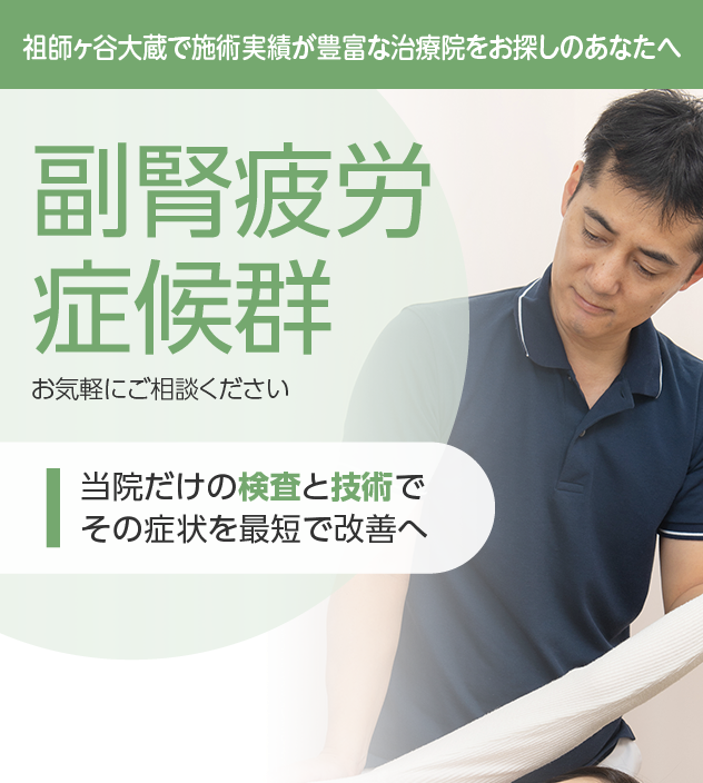 筋肉や関節のみならず自律神経やリンパなど多角的にアプローチする当院の新しい施術は副腎疲労症候群と非常に相性が良く、劇的に改善するケースも見られます。