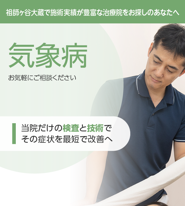 天候の変化と症状の発生に明確な関連があるのが特徴です。他の病気が隠れている場合もあるので注意が必要です。