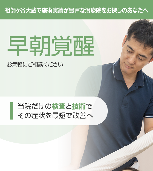 筋肉や関節のみならず自律神経やリンパなど多角的にアプローチする当院の新しい施術は早朝覚醒と非常に相性が良く、劇的に改善するケースも見られます。